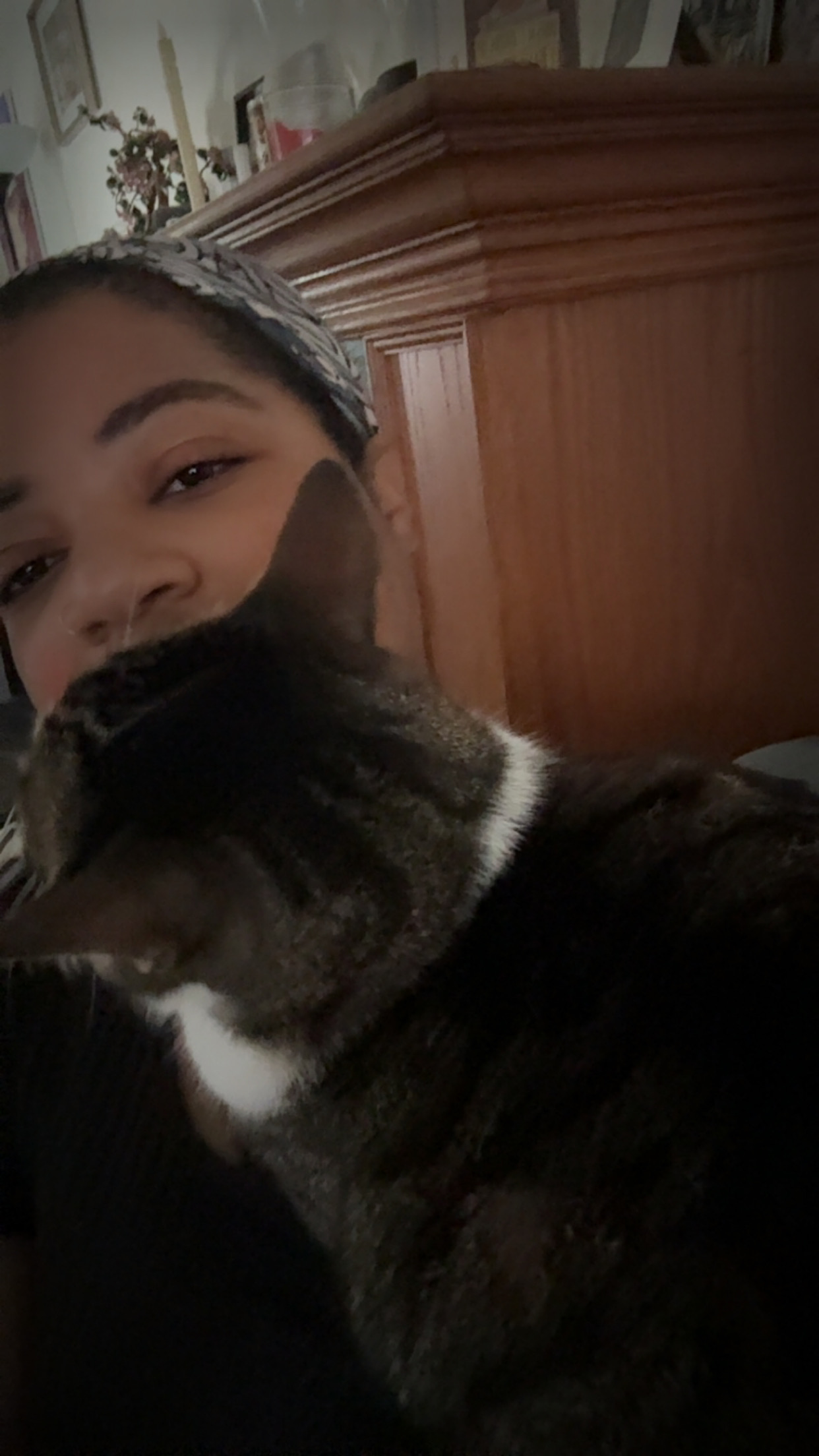 Writing for me starts after the morning duties are complete. My mornings aren’t chaotic, but I have to make sure my daughter has been dropped off at school, and our dog gets a good long walk. I’d say the walk is for his health and wellness, but in truth, I just need to make sure he’s tired enough so I get a moment to write (it’s not always successful). After I take about 10 minutes to pet the family cat (seen rubbing his mouth on my face above), I pull out my laptop and snuggle on the couch to write.